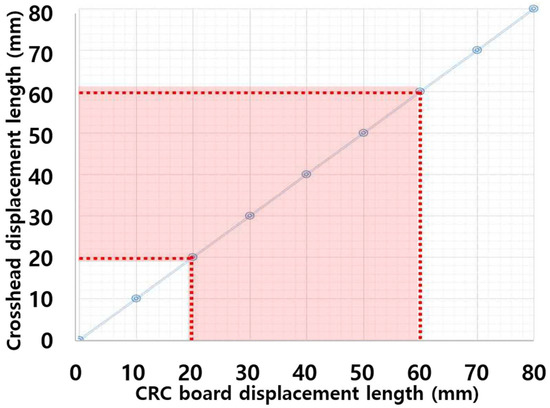 Figure 6, it is observed that the graph precisely follows a 1:1 ratio at a 45° angle. Based on this observation, the testing equipment was designed assuming the movement of the crosshead at a 45° angle while peeling the sample. The graph represents a theoretical measurement process during a peel-off of a waterproofing sheet, where the relevant data of the linear regression line for the crosshead displacement relative to the displacement occurring on the CRC board (blue line, marked by blue circles for the intersection points (
