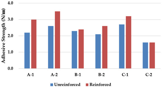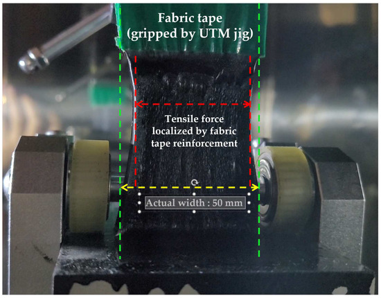 During the peel-out test, it was observed that discrepancies occurred between the test substrate and the test sample. When the adhesive strength of the adhesive layer was higher than the tensile strength of the upper polymer film, differences in elongation occurred between the adhesive area and the self-adhesive waterproofing sheet due to the elongation of the polymer film. Additionally, deviation from the 90° angle between the test substrate and the tensile jig was observed. To control these variables, fabric tape was used to reinforce and restrict the elongation of the polymer film, allowing for the measurement of the pure adhesive peel-out force.