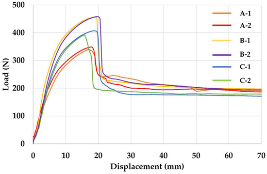 For the peel-out test, the load–peel length curve is divided into four equal sections beyond the initial peel length of 20 mm, as shown in Equation (1). The peel load values (P1, P2, P3, P4, and P5) at the intersection points (