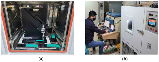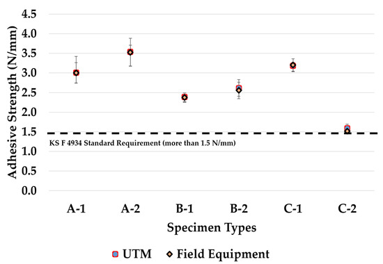 Some important factors that influence the adhesive peel strength include the specimen thickness, the measurement speed, and the onsite temperature. Among these factors, a higher measurement speed results in a higher adhesive peel strength measurement. In the case of KS F 4934, the specified measurement speed was 100 mm/min, which corresponds to the vertical movement speed of the tension jig. However, for the developed onsite equipment, considering that the tension jig moved at a 45° angle, the distance traveled by the tension jig differed by √2 due to the trigonometric calculations. To align the measurement speed with the UTM, it was set to 141 mm/min. Preliminary measurement results showed very similar values to the adhesive peel strength measured by the UTM for the same sample. Based on these results, further testing was conducted.