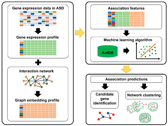 Autism spectrum disorder (ASD) is a neurodevelopmental disease characterized by difficulties in social interaction, impaired communication, and the presence of restricted, repetitive behaviors, interests, or activities [1,2,3,4]. The genetically heterogeneous nature of ASD presents a formidable and multifaceted challenge. It exerts its impact across multiple systems, intertwining genetic, epigenetic, and environmental factors [5,6,7,8]. There has been a growing focus on genetic variants linked to ASD, while immune dysbiosis and gut microbiota have emerged as new focuses in ASD research since 2015 [9]. Significant progress has been made in understanding the genetics, epigenetics, neuropathology, neuroanatomy, neurochemistry, and neuroimaging of ASD [10,11]. In addition, large-scale studies using whole-genome sequencing have proposed several ASD-risk genes and ASD-associated CNVs [12,13,14,15,16]. Recent advances in genomic research have led to the identification of numerous genes associated with ASD. According to data from AutDB [17,18], 1404 genes and 38,296 protein interactions have been implicated in ASD. Additionally, AutismKB [19] has found 1379 genes implicated in ASD. These findings highlight the intricate network of genetic factors contributing to this disorder. Recently, the impact of molecular processes and pathways, such as neurotransmitter release regulation, synaptic function and plasticity, immune system function, and signaling pathways, have become a focus of ASD research [20,21,22]. Despite the identification of several risk genes associated with ASD, the precise genes implicated in ASD development and the specific mechanisms by which they contribute to the disorder are still not fully comprehended [18]. Experimental studies in ASD can be challenging, time-consuming, and resource-intensive due to ethical and practical constraints. However, computational approaches offer advantages, such as the ability to save time and resources, thus enabling researchers to simulate experiments in controlled environments and provide insights across various scenarios beyond specific experiments. Therefore, the utilization of computational methods with a systematic analysis could produce useful results.