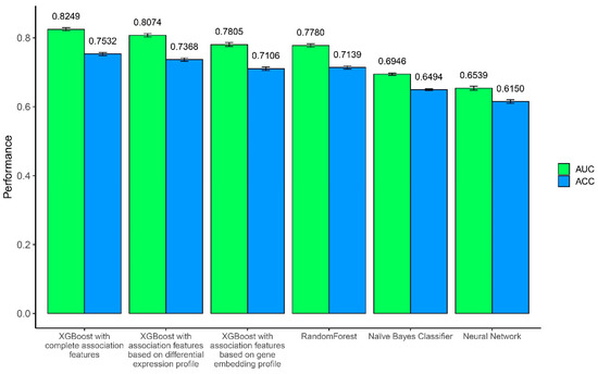 Using the complete association features generated from the differential expression profiles and the gene embedding profiles, the XGBoost classifier yielded the best performance, with an average area under the curve (AUC) of 0.8249 and an average accuracy of 0.7532. Furthermore, we also investigated the impact of different feature sets on classification performance. Therefore, we discarded some of the association features generated from the gene embedding profile and used the same procedures for the classifications. The performance slightly decreased, with an average AUC of 0.8074 and an average accuracy of 0.7368. Moreover, we excluded the differential expression profile from the association features and performed the same classification procedures. The performance further decreased, with an average AUC of 0.7805 and an average accuracy of 0.7106. These results indicate that both the differential gene expression profile and the gene embedding profile are essential for the association classifications.