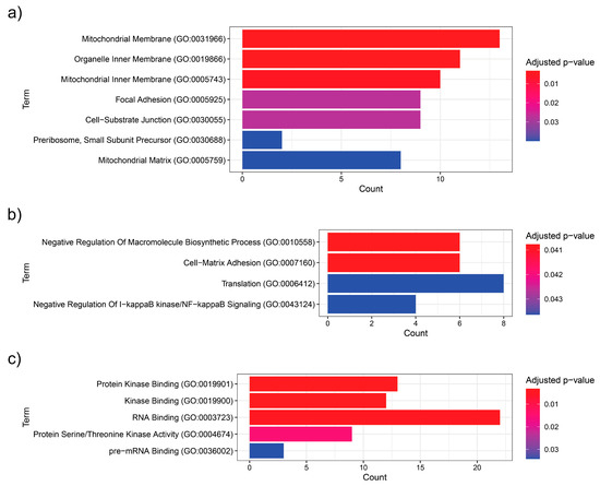 Focusing on the biological process, our enrichment analysis revealed a statistically significant enrichment of the GO term ‘Negative Regulation of Macromolecule Biosynthetic Process’ (GO:0010558), with an adjusted p-value of 0.04077. This suggests the involvement of mechanisms that decrease the rate or extent of the chemical reactions and pathways involved in macromolecule formation. The enriched genes for this term were FXR1, RBM4, HDAC2, GSTP1, CLTC, and RACK1. Additionally, we observed a significant enrichment of the GO term ‘Cell–Matrix Adhesion’ (GO:0007160), with an adjusted p-value of 0.0408. The enriched genes for this term included ACTN2, ILK, PTPRK, FERMT2, PPFIA2, and BCAT2. This term indicated that the adhesive properties by which a cell adheres to the extracellular matrix play a crucial role in cellular processes. Our analysis identified the GO term ‘Translation’ (GO:0006412) as significantly enriched, with an adjusted p-value of 0.04364, implying the significance of cellular metabolic processes at the level of protein formation. The key genes for this term included TSFM, RPL3, EEF2K, RPS19, MRPS22, RACK1, RPL24, and MRPL17. The GO term ‘Negative Regulation Of I-kappaB kinase/NF-kappaB Signaling’ (GO:0043124) showed significant enrichment, with an adjusted p-value of 0.04364, indicating the potential modulation of the I-kappaB kinase/NF-kappaB signaling pathway. The enriched genes for this GO term included TLE1, RIOK3, GSTP1, and SIRT1. A bar plot illustrating these GO terms is shown in Figure 3b.