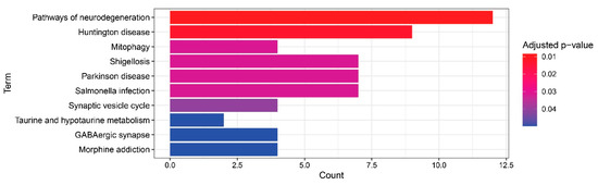 Furthermore, we conducted an enrichment analysis using the KEGG pathway database [45] to identify the significantly enriched biological pathways associated with our gene set. The analysis revealed several KEGG pathways. Interestingly, the pathway of neurodegeneration (an adjusted p-value of 0.00851) emerged as a highly enriched pathway, suggesting its relevance to our study. Additionally, specific neurodegenerative diseases, such as Huntington’s disease (an adjusted p-value of 0.01291) and Parkinson’s disease (an adjusted p-value of 0.03177), were identified as enriched pathways, indicating their potential involvement in our gene set. Additionally, mitophagy (an adjusted p-value of 0.03177), shigellosis (which is also known as shigella infection and is caused by the invasion of the epithelium lining the terminal ileum, colon, and rectum by shigella species [46]) (an adjusted p-value of 0.03177), and Salmonella infection (an adjusted p-value of 0.03177) exhibited significant enrichment, implying their association with cellular processes, infection, and neurodegeneration. The Synaptic vesicle cycle (an adjusted p-value of 0.04044), taurine and hypotaurine metabolism (an adjusted p-value of 0.04984), GABAergic synapse (an adjusted p-value of 0.04984), and morphine addiction (an adjusted p-value of 0.04984) pathways also demonstrated enrichment, suggesting their potential involvement in neuronal function and addiction-related processes. Figure 4 shows a bar plot of these KEGG pathways.