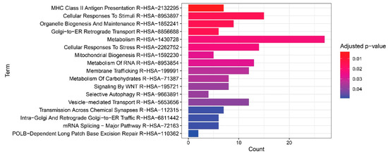 Furthermore, the ‘Mitochondrial Biogenesis’ (R-HSA-1592230) and ‘Metabolism Of RNA’ (R-HSA-8953854) pathways showed significant enrichment (adjusted p-values of 0.02699 and 0.02713, respectively), suggesting their roles in mitochondrial processes and processes involved in the modification of RNA transcription products. Significant enrichment was also observed in the following pathways: ‘Membrane Trafficking’ (R-HSA-199991), ‘Metabolism of Carbohydrates’ (R-HSA-71387), and ‘Signaling By WNT’ (R-HSA-195721), with adjusted p-values of 0.03311, 0.03384, and 0.03777, respectively. Additionally, the ‘Selective Autophagy’ (R-HSA-9663891), ‘Vesicle-mediated Transport’ (R-HSA-5653656), ‘Transmission Across Chemical Synapses’ (R-HSA-112315), ‘Intra-Golgi And Retrograde Golgi-to-ER Traffic’ (R-HSA-6811442), ‘mRNA Splicing-Major Pathway’ (R-HSA-72163), and ‘POLB-Dependent Long Patch Base Excision Repair’ (R-HSA-110362) pathways exhibited significant enrichment (adjusted p-values of 0.03778, 0.03955, 0.04793, 0.04793, 0.04793, and 0.04901, respectively). A list of enriched Reactome pathways is shown in Figure 5. Supplementary Table S5 provides comprehensive information on enriched GO terms and pathways.