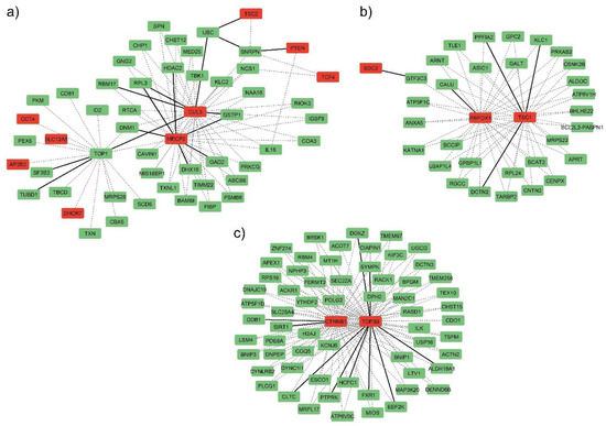 The sub-network shown in Figure 7c contains 64 genes and 124 associations. CTNNB1 and TOP3B were the two genes with the highest degree values (62). Nevertheless, these two genes were already known to be ASD-related genes. CTNNB1 has two known associations (to DDB1 and SIRT1), while TOP3B exhibited known associations with CLTC, PTPRK, HCFC1, FXR1, EEF2K, ALDH19A1, SYMPK, and DGKZ. These connecting genes could potentially be candidates for ASD. All information regarding the associations, association statuses, and gene statuses of all the sub-networks is provided in Supplementary Table S6.