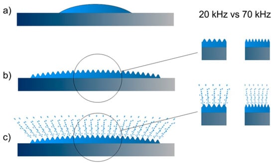 Diagram of the phenomenon of atomization of liquids: (a) a droplet on the surface of the plate, (b) formation of the capillary waves depending e.g., on the operating frequency, and (c) the appearance of liquid droplets in the atomization process (where the higher frequency should cause the release of finer droplets).