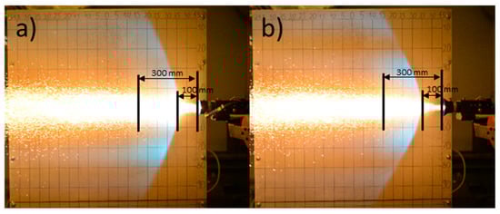 The view of the geometry of the arc melted metal stream: (a) lower (3 bars) and (b) higher (5 bars) working gas pressure.