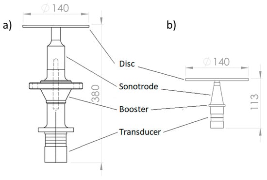 The concepts of the oscillating systems for atomization: (a) 20 kHz system, (b) 70 kHz system, all dimensions are given in mm.