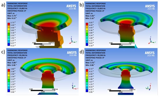Four models were analyzed, differing in the size of the working plate. The diameters of the plate were determined by the standing wavelength formed in the plate during resonance (~20 kHz). They were selected so that the smallest plate has one nodal point (with zero amplitude) and a diameter of 60 mm (Figure 5a). The larger plate, two-node one had a diameter of 108 mm (Figure 5b), the three-node plate had a diameter of 140 mm (Figure 5c) and the biggest, the four-node plate, had a diameter of 190 mm (Figure 5d). The calculations consisted of a modal analysis, necessary to design the appropriate geometry of the plate, and a harmonic analysis to determine the amplitudes of vibrations of the system. For all cases, the same sonotrode forcing (sinusoidal pressure with an amplitude of 50 MPa, which is the acceptable value for most types of materials) was used. In this way, it was possible to compare the effectiveness of the studied types of sonotrodes.