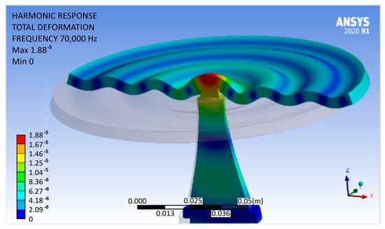 Due to the predicted diameter of the melted metal stream by the TWAS process (in the range of 80–130 mm for the pre-defined stand-off distances of 100 to 300 mm), the smallest plates, with diameters of 60 mm and 108 mm, seem to be insufficient. However, they provide the highest level of amplitude (in the central part of the plate >50 μm), which could have a significant impact on atomization efficiency. The sonotrode with a 190 mm working plate is sufficient for the assumed atomization conditions and the diameter of the melt stream, but it has the lowest amplitudes of the plate’s deflections. Therefore, the selected solution here is a plate with a diameter of 140 mm. It meets both geometrical requirements, and provides a relatively high vibration amplitude of the plate surface.