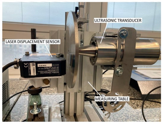 The ultrasonic transducers (20 kHz and 70 kHz) were tested together with mounted plates, each having a diameter of 140 mm. The ultrasonic waveguides were installed on a measuring table (Figure 7, as an example of 70 kHz set-up). The Keyence LK-H008 laser displacement sensor was directed at the surface of the sonotrode. It was moved along the plate by a precise micrometer screw.