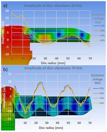 Measurements were made cyclically by moving the optical sensor away from the axis of the sonotrode. At each point, the measurement was made four times by changing the generator amplitude setting. For the purpose of testing the 20 kHz system, amplitudes at four levels of 10%, 20%, 30% and 40% of the range were used, while for the 70 kHz system, 60%, 70%, 80% and 90% settings were used, whereas 100% of the energization corresponds to a maximum value of 1.8 kV supply voltage for a 20 kHz transducer and 300 V for a 70 kHz transducer. The obtained results are presented on a graph of the amplitude distribution depending on the distance from the center of the plate (Figure 8).