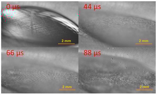 Figure 10 shows the individual frames obtained for the 70 kHz system. It can be clearly seen that the time from the moment of switching on the system to the moment of cavitation is twice as long. This is due to the characteristics of the 70 kHz system itself, which cannot be fine-tuned prior it is switched on. So, the delay is caused by tuning the system when turned on. However, from the moment of observing cavitation in a droplet of water (Figure 10b) to the time of triggering the phenomenon of the ultrasonic fountain (Figure 10d) about 44 μs have passed.