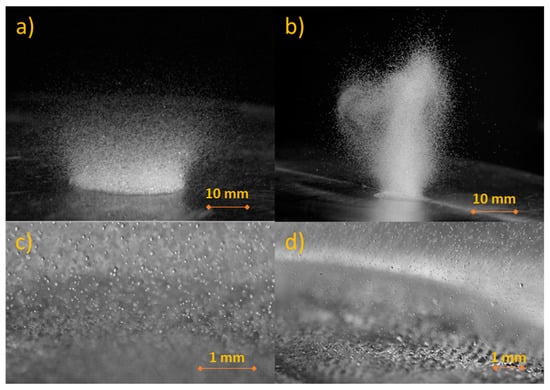 Selected photos of the process of atomization of water droplets on a macro scale are presented in Figure 11a,b and on the micro scale in Figure 11c,d. Macro photos show a fountain of liquid as a whole, and micro photos allow observing only selected fragments of a column of atomized droplets, but with a much higher resolution. They were recorded from a shorter distance, thanks to which it is possible to analyze the morphology of the droplets and make a histogram of the distribution of their size.