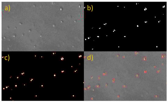 The next step was to adjust the background (Figure 13). For this purpose, a median filter was used to remove random peaks and a low-pass (averaging) filter was used to extract the background. This is achieved by using a filter mask the size of which (in pixels) exceeds the size of the largest droplet, which leads to the removal of droplets from the image and averaging the background. The background thus extracted was subtracted from the original image and the image was ready for the threshold process. The threshold value was chosen so that the image after binarization only took into account droplets without the background.