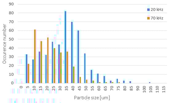 In the next step, the droplet size distribution results were obtained and compared. A histogram showing the comparison of results obtained for 20 kHz and 70 kHz transducers is presented in Figure 15.