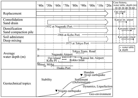 When any type of infrastructure is constructed and soft soil is encountered, over an area, high levels of ground settlement and problems of stability failure and liquefaction are anticipated. Many types of ground improvement techniques have been developed and applied to many infrastructures as a countermeasure to these problems. Figure 1 shows the historical evolution of major ground improvement methods and the historical transactions in the field of geotechnical subjects in Japan []. Historically, a major geotechnical subject was the “stability problem” in the 1940s and the 1950s. It is not an exaggeration to say that the stability problem was the only issue that could be dealt with at that time due to insufficient development in geotechnical engineering and construction machinery. Replacement methods were frequently applied for stability problems, where the soft clayey soil stratum was entirely or partially excavated and replaced by sandy material prior to construction of the superstructure. After the development of consolidation theories in the 1940s, “ground settlement” became one of the main geotechnical subjects of discussion, together with the stability problem in the 1950s. In order to accelerate the consolidation process and to reduce the residual settlement, several improvement methods, which may be categorized into “consolidation”, were developed in the 1950s and the 1960s. Among them, the sand drain method was first applied at Nagasaki Port in 1952, which was followed by several applications in the 1950s to the 1960s. In order for ground settlement and deformation control to be applied, several densification methods were developed in the 1950s and the 1960s. In 1956, the first type of sand compaction pile (SCP) machine with a hammering device was developed in Japan for the densification of sandy ground (Figure 2). After various developments in machinery, the SCP method with a vibro-hammer was developed in 1959. Following its successful application to marine clay deposits, the SCP method has been applied not only to sandy ground but also to clay ground in many marine as well as on-land construction projects []. After the Niigata Earthquake in 1964, the dynamic behavior and liquefaction of sandy soil became one of the key issues in the field of geotechnical engineering. A lot of research efforts have been carried out on the dynamic properties of soil and countermeasures for liquefaction since then. In the period of rapid economic growth in the 1970s, the introduction of soil admixture stabilization was desirable for a rapid strength gain and high stiffness. In the 1970s, the deep mixing method (DMM), one of the in situ soil admixture techniques, was developed and put into practice (Figure 3). Due to the rapid strength increase of the soil, the DMM has been frequently applied to improve many kinds of foundation in marine and on-land construction []. In the 1970s and the 1980s, soil and groundwater contamination became one of the most pressing social problems. Since then, the management of waste landfill and contaminated sites has been a serious concern for those working in the discipline of geotechnical and geo-environmental engineering. This required the development of new ground improvement techniques to construct impermeable barriers for disposal sites and the enhanced beneficial use of dredged soft soil, subsoil and industrial waste, and also of any by-products. Many soil admixture stabilization techniques, such as the liquefied soil method, the light-weight soil method [] and the pneumatic flow mixing method (ref. []) were developed and put into practice in the 1990s and the 2000s.