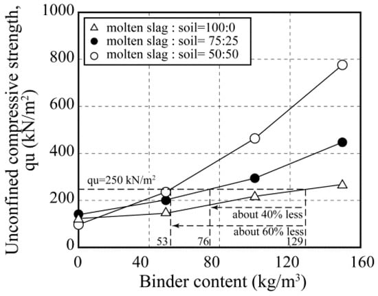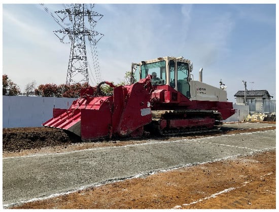 Recently, a new ground improvement method has been developed in which molten slag and biochar, as well as cement, are mixed with soil in situ [,,]. The molten slag is produced by incinerating ash melted at a high temperature and cooled down, which is expected to improve the soil properties of clayey soil and can then reduce the required amount of cement for stabilization. The Japanese Industrial Standards (JIS) specified the quality and environmental safety requirements of the molten slag in 2006 to promote its utilization in civil engineering work and to prevent adverse impacts on the environment. Biochar is a material carbonized by the incomplete combustion of biomass raw materials, and functions to aid in the storage of carbon dioxide in the ground. By increasing the amount of biochar mixed, it is expected that carbon negativity will be achieved, in which the sum of CO2 emission reductions and fixed amounts exceeds the emissions, which can bring about a sort of decarbonized ground improvement method. In construction, molten slag, biochar and cement are spread on the ground and mixed and compacted to build a stiff, shallow layer (Figure 6 []). The amounts of molten slag and biochar are 550 to 1750 kg/m3 and 10 to 30 kg/m3, which can reduce the amount of cement that needs to be used to about 60% of the cement used in the existing methods, as shown in Figure 7.