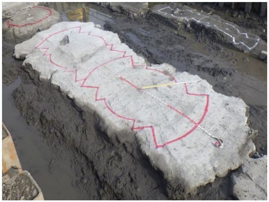 Recently, a new type of SCP method has been developed to achieve carbon dioxide reduction, in which biomass is discharged into the ground together with sand [,]. The sand is expected to increase the strength of the compacted pile, and the biomass is expected to store CO2 in the ground. Since the amount of carbon dioxide stored in the ground is overwhelmingly larger than the CO2 emitted in ground improvement work, this new technology can be described as being a “negative emission technology”. A field test revealed the high applicability of the biomass material, bamboo chips, in which the strength and shape were confirmed to be equivalent to those of conventional sand piles (Figure 4 and Figure 5 []). In the SCP method, a total of 5 kg CO2 per m3 of improved ground is emitted in construction when natural sand is used. In this new SCP method, however, carbon dioxide can be stored in the ground and the amount of CO2 emission can be decreased to −20 kg CO2 due to a larger amount of stored CO2 than the amount that was emitted during construction.
