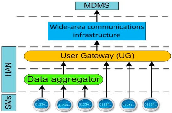 Figure 1, the AMI system consists of various technologies and applications that combine to function as a single entity. These technologies are SMs, user gateways (UGs), wide-area communication infrastructure, and Meter Data Management Systems (MDMSs). Brief descriptions of these technologies are mentioned below: