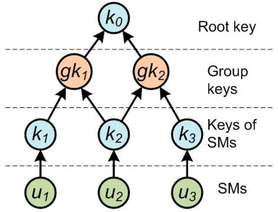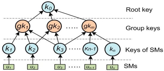 . This is a set that is finite and non-empty, where {k1, k2, …, kn} represents the keys of NXs. {gk1, gk2, …, gkm}. “k” represents the group keys of demand response projects, and “k0” is the root key of the key hierarchy.