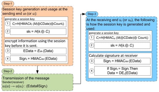 An initial session key generation is required. The session key ski is built in Steps 1.1 and 1.2 using the metering data Mi, the metering date CDATE, the value Counti, and the user key ki. In Step 1.3 and Step 1.4, upcoming information for sharing is encrypted and signed using this session key before it is sent. In step 2, the data that have been encrypted together with the signature value are sent to the recipient. In step 3, the receiver is able to obtain the components that are required to produce the session key. Step 3.1 and Step 3.2 are responsible for the generation of the session key ski. It is possible to decode the data and verify the signature using the session key provided. Step 3.3 and Step 3.4 are responsible for verifying the signature between the transmitter and receiver before extracting the data using the decryption function (DE).
