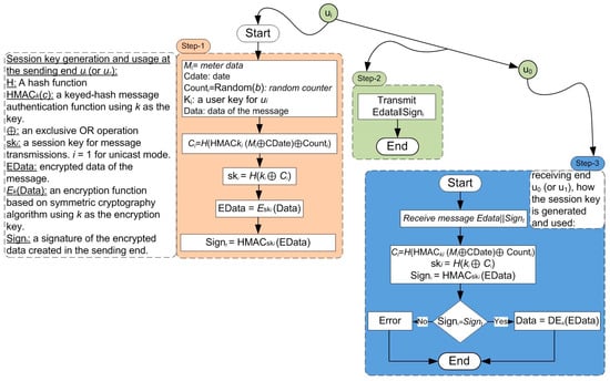 Messages in AMI systems were analyzed, and the results revealed that the unicast transmission method comprises three distinct kinds of messages: the remote load control, meter data, and subscription to or cancellation of DR projects. The messages may proceed either way, from the MS to the SX or from the SX to the MS. It is essential that both the secrecy and the integrity of the communications are maintained throughout the process of communication. In order to accomplish this goal, the session key has to be reset at the beginning of each session.