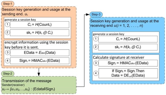 The variables Count0 and the root key k0 are used in Step 1.1 and Step 1.2 to produce the session key sk0. The information for transfer is encrypted and signed using this session key before being sent in steps 1.3 and 1.4. In step 2, the data that have been encrypted together with the signature value are then sent to all the recipients of SXs. Step 3.1 and Step 3.2 generate the session key at the recipients then Step 3.3 calculates the receiver signature. In Step 3.4, the recipients compare the transmitter signature and recipient signature, if there are equal, and the information is decrypted.