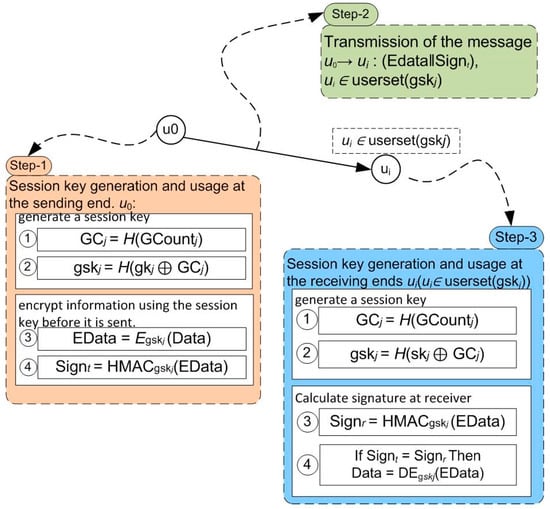 The publishing of DR projects and information on energy prices are both messages that may be delivered using the broadcasting technique in order to ensure the message’s secrecy and authenticity; the session keys must be updated before each broadcast session. The three stages of detailed key management for broadcast communication are depicted in