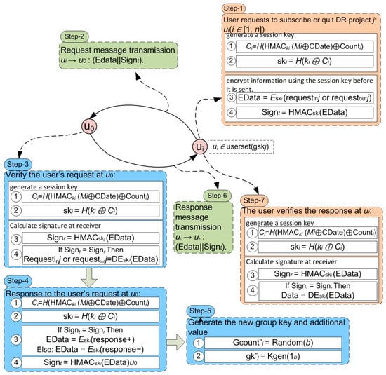 It is necessary to generate a session key initially. In steps 1.1 and step 1.2, the value GCountj is used to determine the group key gkj, which is used to generate the session key gskj. The information for transfer is encrypted and signed using this session key before it is sent in Steps 1.3 and 1.4. The receipts of DR project j receive data that have been encrypted together with the signature value. In step 3.1 and step 3.2, the receipts in the DR project regenerate the session key gskj. It is possible to decode the data and verify the signature using the session key provided in Step 3.3 and step 3.4.