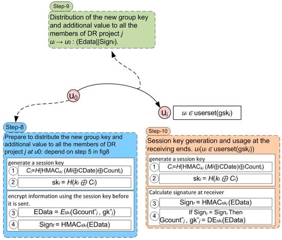 Figure 10 depicts steps 8 through 10 for regenerating and dispersing the new group key with an additional value. Step 8 prepares to distribute the modified group key and the added value to each DR project j member. The new group key and additional value are distributed in Step 9 to every single person in the DR project j community. In step 10, the user utilizes the new session key.