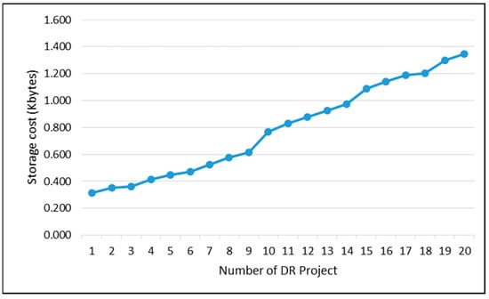Figure 11 shows the relation between the number of DR projects and the storage cost in Kbytes. From this figure, it is shown that when the number of DR projects increases, the storage cost also increases.