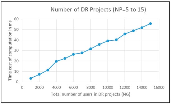 Figure 12 shows the relation between the total number of users in DR projects and the time cost of the computation. It is shown that when the number of users increased, the time cost of computation increased. It is also shown that when the number of projects changed from 5, 10, and 15, however, the time cost of computation did not change. Thus, the time cost of computations depended on the number of users, not the number of DR projects.