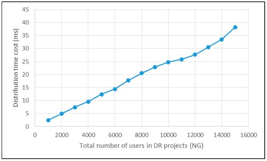 The time cost for key distribution depends on the number of users in the DR project. Therefore, with 1000 users, the distribution time would be about 2.48 ms, and for 10,000 users, the distribution time would be about 24.77 ms.