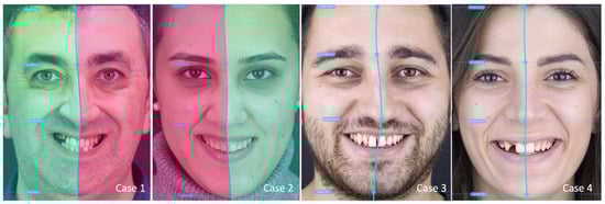 The classification of cases was based on the relationships between reference points on the forehead, nose, and chin tip, which are significant in smile designs. Specifically, the trichion, glabella, subnazale, and menton points were utilized as references to determine the facial flow. By examining the axis formed by connecting these points, we identified four distinct cases: Case 1 represented a facial flow towards the right side, Case 2 represented a facial flow towards the left side, Case 3 represented a scenario where the nose and chin pointed in different directions, and Case 4 represented a symmetrical face (Figure 1). To aid visual clarity, we utilized a color scheme in Figure 1, where the side with the facial flow direction was depicted in green, while the opposite side was shown in red. However, it is important to note that in neutral cases where the nose and chin tips were directed to different sides while maintaining facial symmetry, no green or red sides were indicated [19].