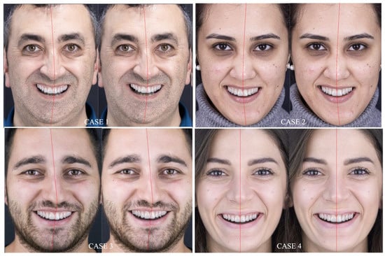 - Silva, B.P.; Jiménez-Castellanos, E.; Martinez-de-Fuentes, R.; Greenberg, J.R.; Chu, S. Laypersons’ perception of facial and dental asymmetries. Int. J. Periodontics Restor. Dent. 2013, 33, 162–171. [Google Scholar] [CrossRef]