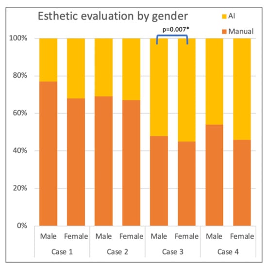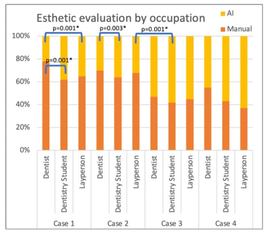 In contrast, when examining Case 4 (which featured a symmetrical facial feature), there was no significant difference in preference for manually created or AI-generated designs among dentists and other occupations (p = 0.001). It can be concluded that in complex cases, dentists’ esthetic perception is different from that of people in the non-professional group [13].