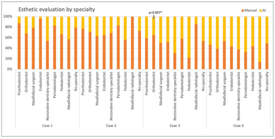 When the preference rates for manually and AI-generated smile designs were evaluated according to the area of specialty or status of the dentists (expert or not), it was found that the difference between orthodontists and other specialties was statistically significant only for Case 3 (p = 0.025). Orthodontists generally preferred the AI-generated smile design (70.96%), while dentists in other specialties preferred the manually created design (51.88%) (Figure 4).