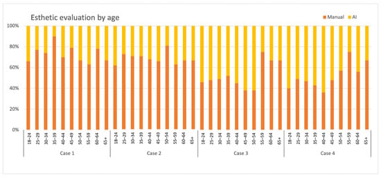 When choosing between manually-created and AI-generated smile designs, the age of the individual (divided into ten groups ranging from 18–24 to 65 and above) (Figure 5), their education level (high school/middle school, associate degree, and undergraduate), and the clinical experience of the dentists (0–9 years, 10–19 years, and 20 years or more) were not found to be influential factors (p > 0.05). The chi-square test also showed that gender was not an influential factor in Cases 1, 2, and 4 (p = 0.359, p = 0.464, p = 0.611, respectively). However, for Case 3, a significant difference was observed between males and females, with females preferring AI-generated smile designs over manually-created ones (p = 0.007) (Figure 6).
