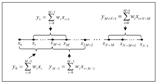 where N represents the length of the current data stream, with denoting the elements of the data stream, and represents the constant coefficients of the FIR filter’s impulse response.