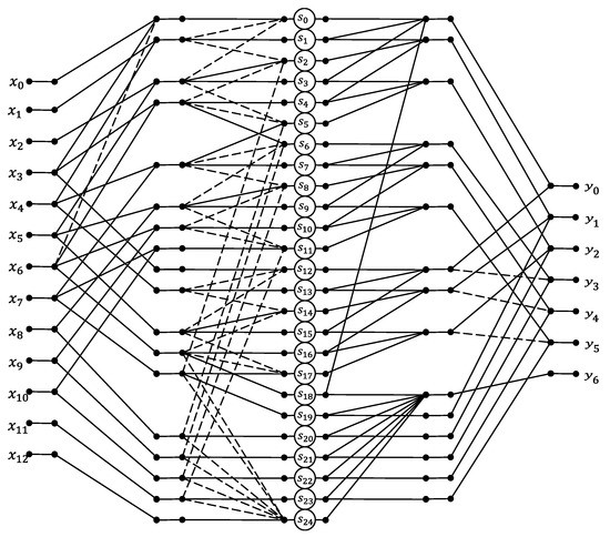 Figure 2 depicts a data flow graph of the proposed algorithm for implementing the basic filtering operation for a 3-tap FIR filter. In this paper, the data flow diagrams are arranged from left to right, and straight lines in the figures represent data transfer operations. The circles in these figures indicate multiplication operations, with the corresponding numbers written inside the circles. The convergence points of the lines indicate summation, while dashed lines represent data transfer operations with a simultaneous change of sign. To maintain clarity, the figures utilise simple lines without arrows. Furthermore, to simplify the presentation, the superscripts of variables have been omitted in all figures, as the vector sizes involved in each case can be inferred from the figures themselves.