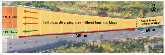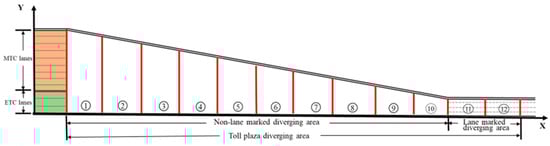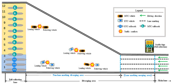 2]. However, vehicles with different toll collection types are not restricted by lane markings or separation facilities in the diverging area of the TMTP. Vehicles need to complete the diversion and select their matching toll collection lanes within a limited distance. Complex distribution of toll collection lanes and speed difference of ETC and MTC vehicles result in the diverging area becoming a hot spot of frequent crossing behaviors and rapid decelerations [