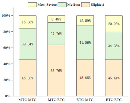 Figure 1. Each combination indicates the toll collection type of the leading vehicle followed by the toll collection type of the following vehicle. Considering the ordinal nature of conflict risks and the unobserved heterogeneity of influencing factors, a heterogeneous random parameters ordered logit model is employed to analyze the causes of conflicts among vehicles with different payment methods.