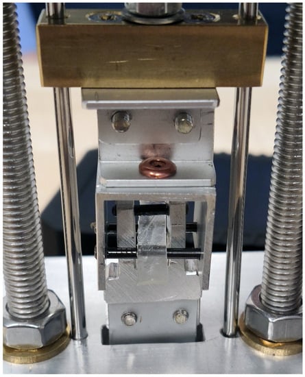 After curing, the specimens were subjected to mechanical testing using a three-point bending test. The specimen was securely clamped into the testing machine, ensuring the test region was free from obstructions or constraints. The device applied a controlled bending force at specific points along the sample while measuring the applied load and the resulting deflection [18,19]. More specifically, we used a three-point bending test instrument owned by the University of Insubria (Buster model 8526) (Figure 2). The setup of the test consisted of a three-point bending test with 5 mm between the center and the ends. Each sample was evaluated with bending of 1 mm, the instrument was calibrated to perform 20 steps, and each step was 50 microns. The descent speed was set at 500 microns/minute. Then, 20 steps in one direction, and when the maximum deflection point was reached, 20 steps in the opposite direction, were taken to assess the deflection, and a total of 40 steps were sampled. The chamber in which the tests were carried out was a controlled atmosphere, with a temperature of 28 °C and 80% humidity, the maximum operating temperature at which the testing instrument maintains its accuracy and reliability. Each test was repeated 5 times for each sample. The obtained data were exported to Excel (v365 Microsoft, Redmond, WA, USA), reporting a distance column and a force column for each test. All the obtained data were thus statistically analyzed using SPSS v26 software (SPSS Inc., Chicago, IL, USA).