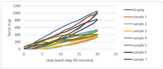 Using the maximum load values obtained from the mechanical tests, a graph was constructed to evaluate the behavior of the materials. This table allowed for a direct comparison of the mechanical properties of the resin-based materials and the nickel-titanium wires, including their maximum strength and overall mechanical performance. The table was used to highlight any trends or patterns in the results and to identify all the areas where the resin-based materials performed similarly or differently from the nickel-titanium wires. This information was crucial in determining the potential use of resin-based materials as an alternative to traditional orthodontic materials and in understanding their behavior under stress. The graph provided a visual representation of the results. It allowed for an easy comparison of the mechanical properties of the tested materials (Figure 4). Figure 4 will be useful in future studies on the use of resin-based materials in orthodontic treatments.