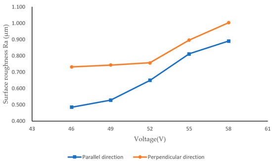 - The integration of spark discharge with diamond wire sawing facilitates the spalling of Al2O3 ceramic, which results in the increase of surface roughness. The roughness in parallel and perpendicular directions increases by 7.30% and 16.7%, respectively when 46 V is applied. The surface roughness increases with the applied DC voltage and when the applied voltage is 58 V, the roughness increases by 116% and 38.2%, respectively.
