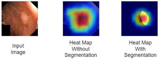Grad-CAM works by checking the last convolutional layer before and after the examination of gradient information that is flowing to that layer. In our case, we applied the transfer learning concept and used the pre-trained Xception model, as it provides the best heat maps, and is therefore used for classification as well. The results of the image and its heat map before and after segmentation are shown in Figure 5. It is apparent from Figure 5 that after segmentation, the model is more focused, and looks exactly at the diseased region as the high-magnitude area; therefore, we used images with contours drawn around the diseased area for classification.