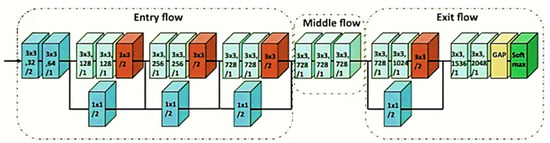 The Xception model is based on CNN with depth-wise separable convolutional layers. This model has 36 convolutional layers that are arranged into 14 modules. In simple terms, the Xception model is a depth-wise separable CNN with a residual connection. The architecture of Xception is shown in Figure 6. The authors of [42] proved through experimentation that Xception outperforms other CNN models like VGG-16, ResNet-152, and Inception V3 on the ImageNet dataset.