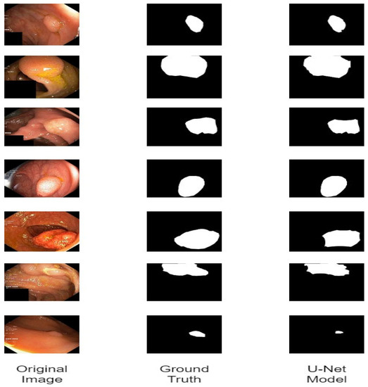 Qualitative results of segmentation and localization of polyps based on the Kvasir-Seg dataset are shown in Figure 7. By looking at the ground truth, it can be noticed that the segmentation results generated by UNet with the ResNet-34 model as a background are up to the mark. Furthermore, the results show that the model detected the large diseased area and produced high-quality masks at similar locality but with a slightly different shape. This same segmentation model is applied to all other classes, like ulcer, polyp, ulcerative colitis, and esophagitis, for drawing contours around the diseased area and passing these images for classification.
